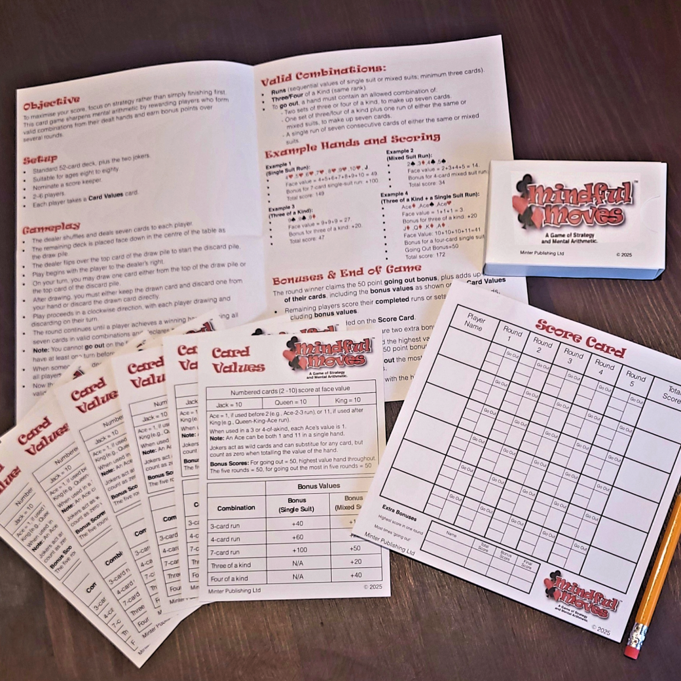 Mindful Moves is the ultimate family card game that blends strategy, quick thinking, and mental arithmetic into every round. Easy to learn but endlessly engaging, it's designed for all ages, challenging players to outsmart their rivals by building clever combinations, maximising scores, and discovering unique ways to win through bonuses. With every hand, you sharpen your mind and share real fun, making Mindful Moves a must-have for game nights, classrooms, and anyone who loves smart play. Play, think, and win together; Mindful Moves makes every move matter!